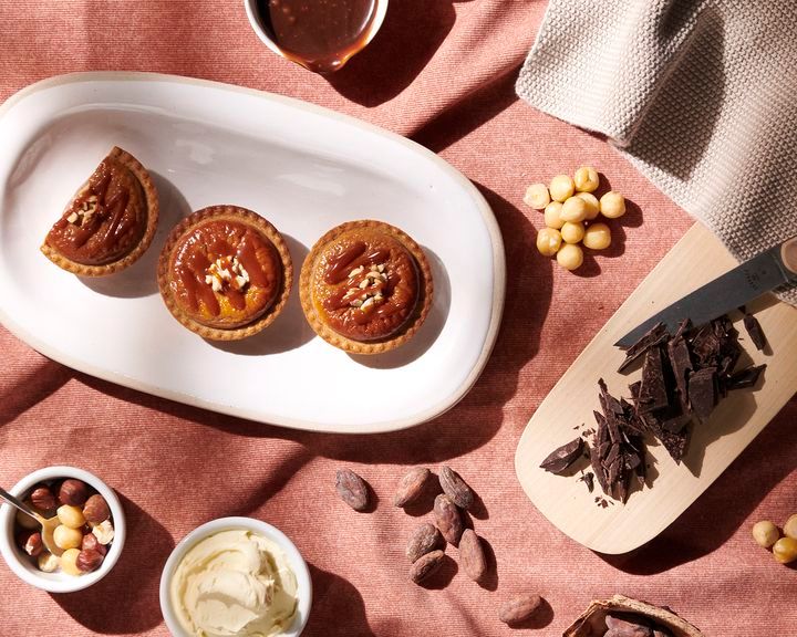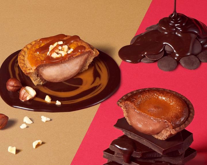 「焼きたてカスタードアップルパイ ショコラ&ヘーゼルナッツ」はチョコレートとローストヘーゼルナッツを組み合わせた相性抜群のアップルパイ。チョコレートをしっかりと楽しめるよう板状のミルクチョコレートを挟み、ローストヘーゼルナッツペースト入りのカスタードクリームを合わせました。贅沢にザクザク食感のヘーゼルナッツとチョコレートをトッピングした、食べ応えのあるアップルパイです。