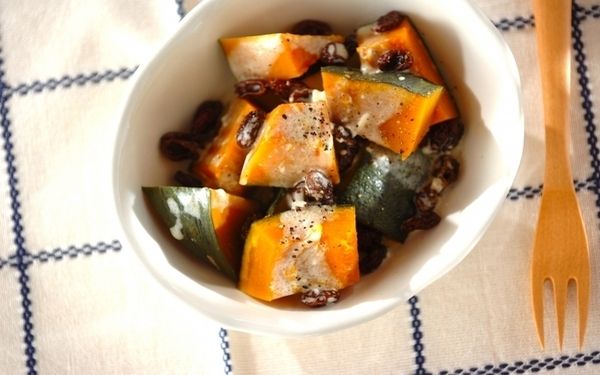 カボチャとレーズンの甘いサラダに、甘酒で作ったドレッシングを合わせます。クリームチーズは常温でやわらかくしておくと伸ばしやすいですよ。甘酒は一度に加えず、少しずつ混ぜましょう。チーズの塩気と甘酒の甘みで、ワインが進むサラダです。