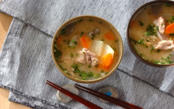 甘酒で作る豚汁は、深みがあって15分で作ったとは思えない美味しさです。豚肉の脂が野菜に行き渡ってコクたっぷり。ゴボウやジャガイモなど好みの具材でアレンジするのもおすすめです。甘酒とみそは仕上げに加えて風味を楽しみましょう。