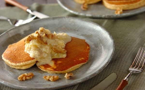 砂糖と牛乳を使わず、甘酒で作るパンケーキです。米糀甘酒はお米の粒があるので、ミキサーにかけておくのがポイント。なめらかで生地に混ざりやすくなりますよ。パンケーキ生地に甘酒を入れると、もっちり食感になるのが特徴。リンゴソースの代わりに、ホイップクリームやジャムなどアレンジを楽しんでくださいね。