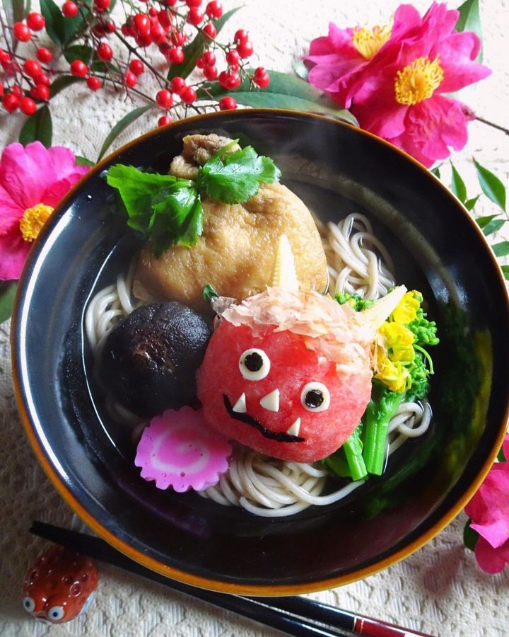 そばの上には、大根おろしアートの赤鬼がちょこん。
