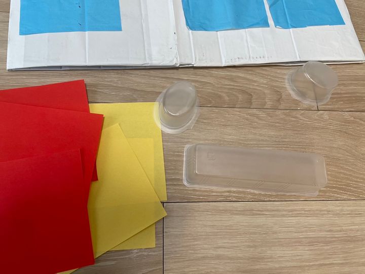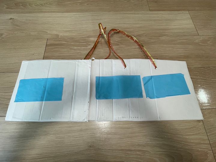 私は白い紙や折り紙を貼り付けて段ボールの色を隠しました。