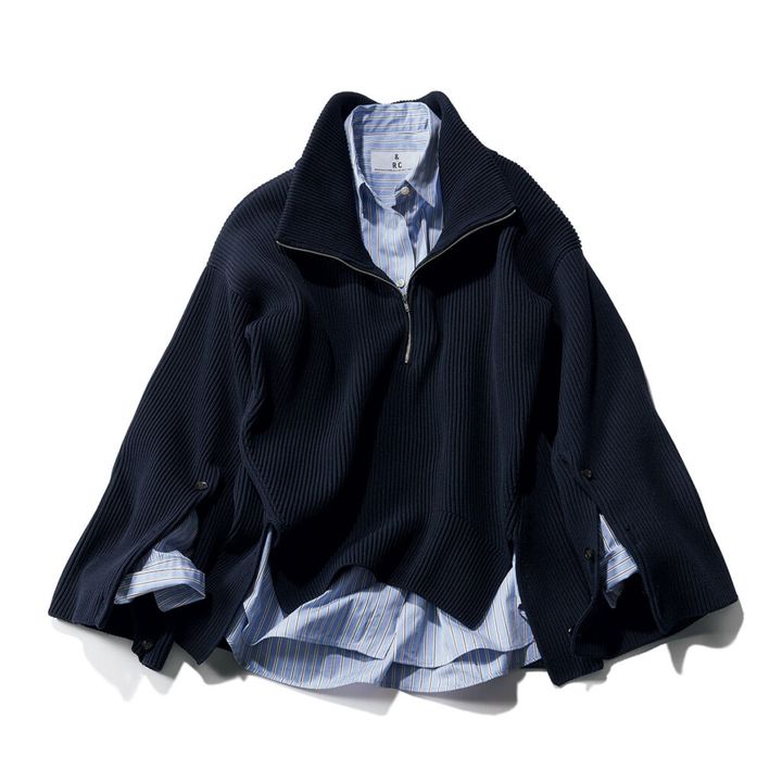 ストライプシャツが持つ正統派な表情を、マント風シルエットが目を引くスキッパーニットで個性的にアレンジ。ニットは程よく肉厚で、この季節なら軽アウター感覚で取り入れられるのも便利です。