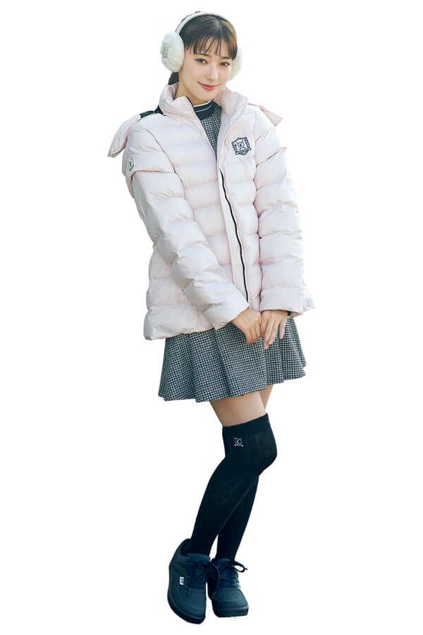 起毛素材の帽子やプルオーバー、中綿入りのドット柄スカートで、防寒性をグッと底上げ。胸元まである長めのファスナーなら体温調節も簡単♪
