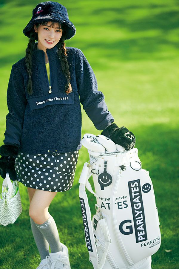 プルオーバー¥33,000/Samantha Thavasa UNDER25&No.7(Samantha Thavasa UNDER25&No.7 新宿高島屋店) ニット¥23,100/ヒールクリーク、バッグ¥7,590、靴下¥1,980/ともにVIVA HEART(ともにグリップインターナショナル) スカート¥6,930/キスオンザグリーン 帽子¥12,100、キャディーバッグ¥70,400、ヘッドカバー[DR用]¥8,800、[FW用]¥8,580、[UT用]¥8,360、シューズ¥28,600/以上パーリーゲイツ 手袋¥7,700/CELFORD GOLF(CELFORD)