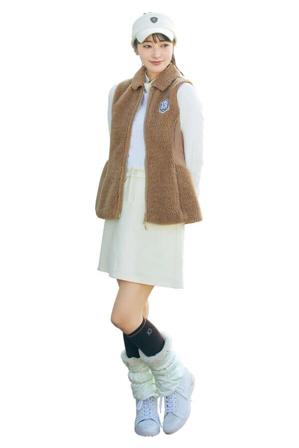 冷え込む冬のゴルフ場で癒しの存在になるなら、温かみと甘さを感じるラテ配色で♪ モコモコのボアベストをオンすれば、防寒も彼ウケもダブルで叶います。