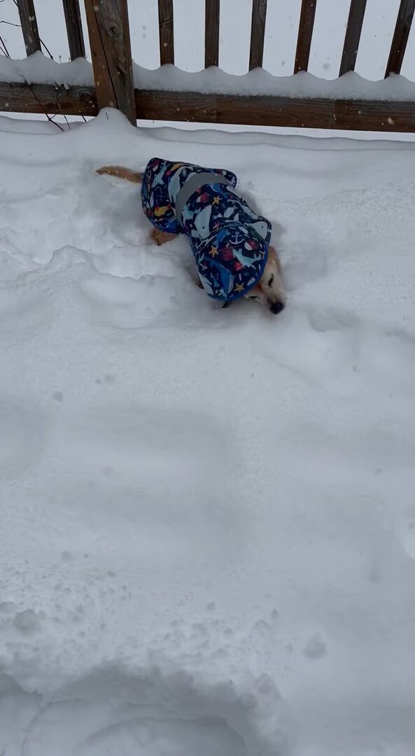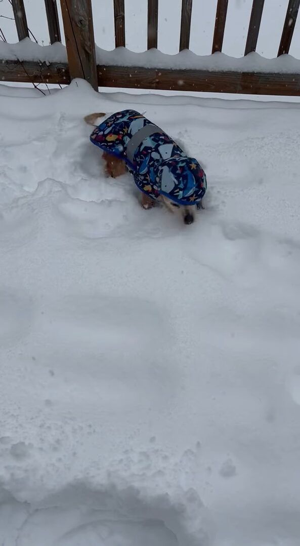 雪遊びが大好きなチウィーニー。ジャケットも着込むとぴょんぴょん跳ねて楽しそう!!【海外・動画】
