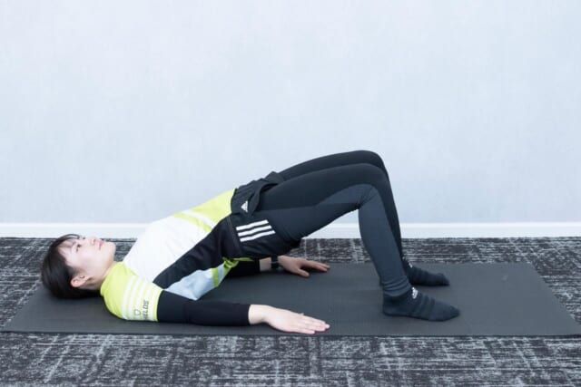 (2)肩とひざを一直線にするイメージでお尻を締めながらゆっくり引き上げ、引き上げきったら5秒間キープする