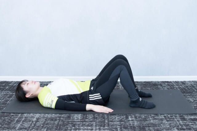(1)仰向けになって両腕を体側に置き、両脚を肩幅に開いてひざを直角に曲げて立てる