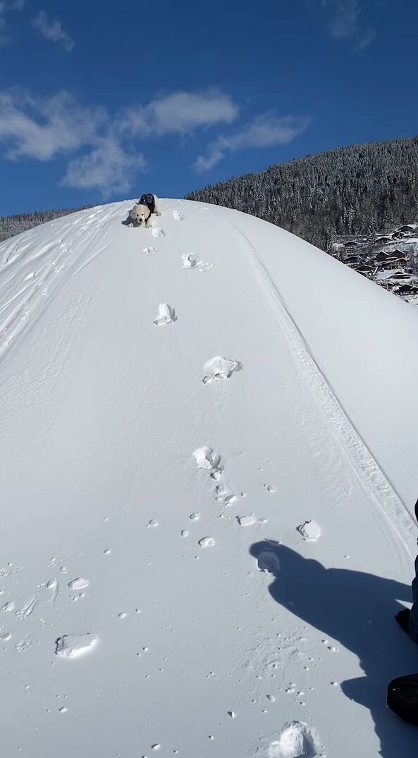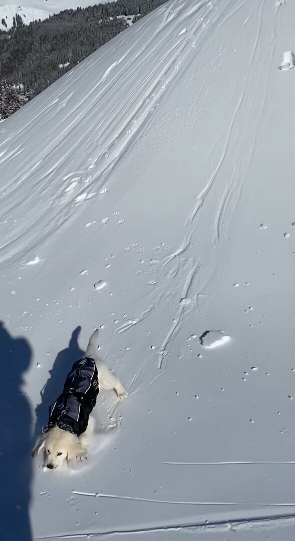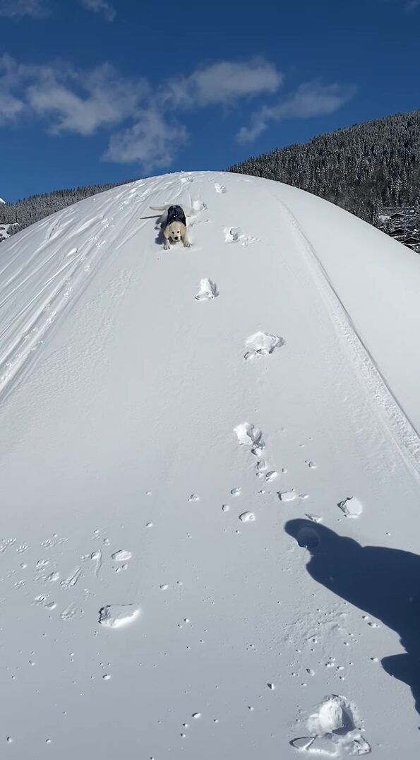 雪が積もった丘を滑り下りる子犬。 その様子は、こちらの動画からご覧いただけます。