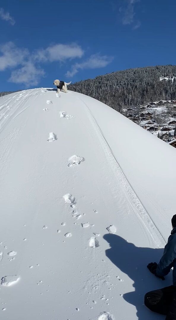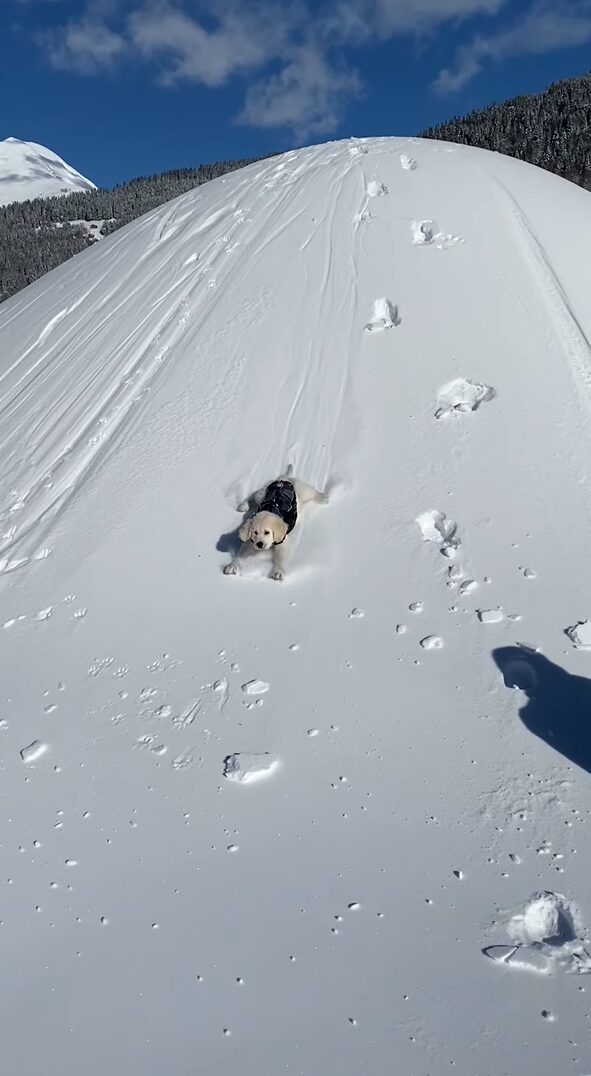ジャケットを着て、雪の降った丘にのぼったゴールデンリトリバーの子犬。 おなかを斜面にくっつけて腹ばいになると、まるでスノーボードのようにスルスルーっと滑り下りてきました!!