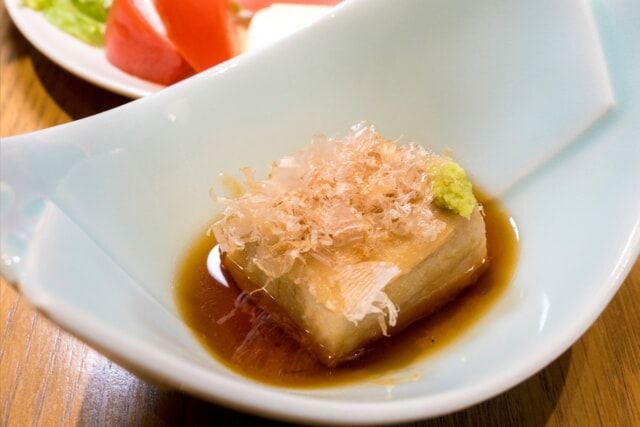 自家製のゴマ豆腐を鉄板で焼き、ステーキにするのは初めての味。出汁とわさび、糸鰹が添えられて、まわりはカリっと中はまったりと柔らか。濃厚な胡麻の風味が広がる逸品です。