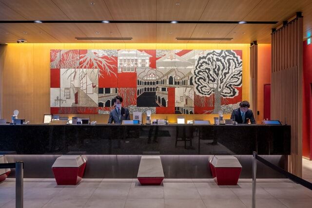 銀座といえば歌舞伎の街。モダンでありながら、日本の伝統も息づく土地柄です。ホテルのレセプションを飾るタペストリーは、日本を代表する着物デザイナー斉藤上太郎氏が大胆にデザインした西陣織。背景は檜(ひのき)の突板で仕上げられ、床は紙すきを思わせる美しい石材をめぐらします。横一文字に貫く漆黒のカウンターが、周囲を引き締める存在です。
