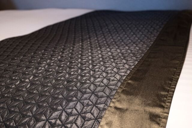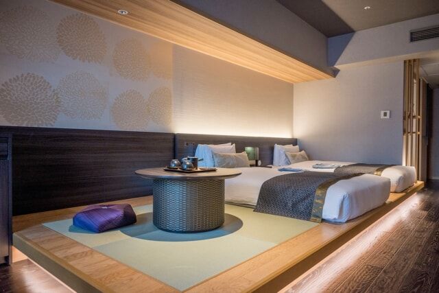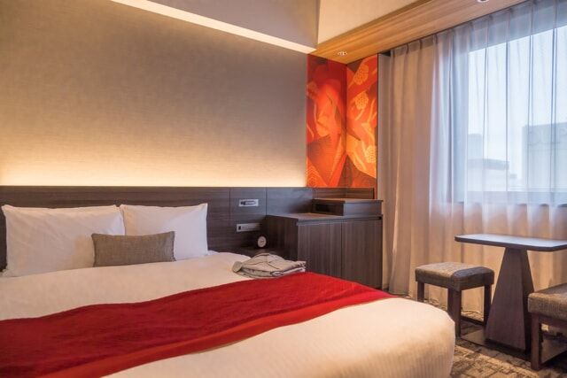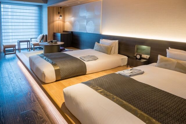 客室はダブルやツイン、トリプルのほか、サンリオのキャラクター「ポムポムプリン」とコラボしたコンセプトルームを3タイプ用意する全338室。広さは17.3平米から34.6平米までの5タイプです。ベッドマットはアメリカのサータ社を採用。館内や客室には、伝統的な5つのカラー(千歳緑、藍、朱、金、いぶし銀)が使われ、それぞれの色を活かすため余白を残し、落ち着きや艶やかさを表現。客室タイプによって色使いが異なり、それぞれ趣のある空間をかたちづくっています。