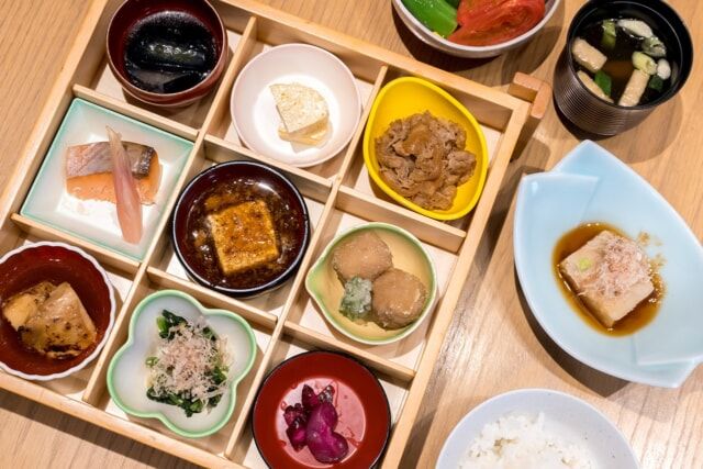 朝食は2階にある和食ダイニング「SHARI(シャリ)」で、和食膳や洋食膳のハーフビュッフェを用意します。