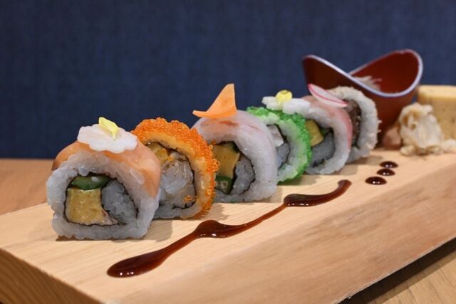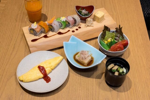 6種類のロール寿司は可愛らしくて色も華やか。チキンロールはトビコのプチプチ感が心地よく、牛香味ロールは牛肉の旨味が広がって、ひとつずつ違う味を楽しみながらいただきました。添えられた玉子焼きは少し甘味があって、もうひとつのメイン料理「和食膳」の出汁巻き玉子とは味わいを変えるなど、ひと品ずつ丁寧に作られていることを感じます。