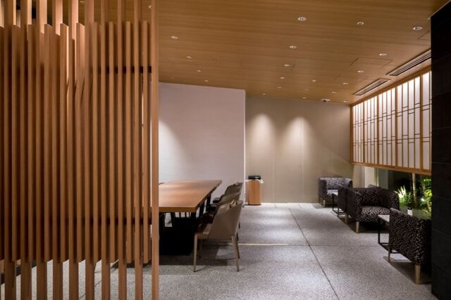少し低めの天井に雪見格子のような設えで、誰もが使える落ち着いた空間です。ラウンジに流れる心地よい BGM は、6時から23時まで日本らしさを感じる KABUKU MUSIC、23時から6時までは和の静寂を思わせる WABI SABI をテーマにアンビエント・ミュージックが流れます。