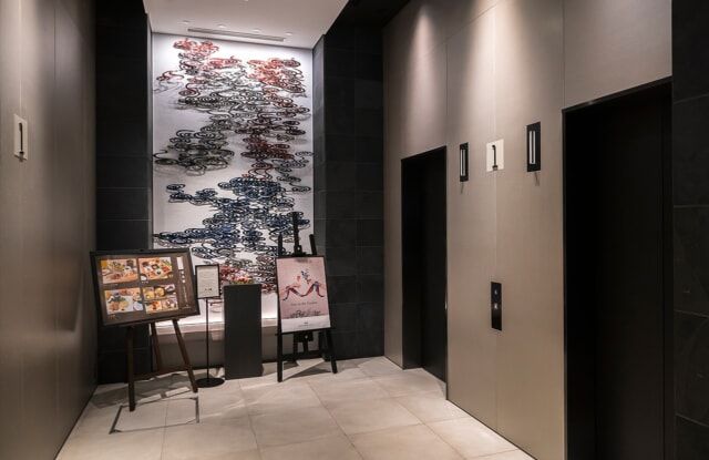 エレベーターホールでは日本画などに見られる流水紋を立体的にディスプレイ。銀座はかつて日比谷入り江を囲む半島だったことから、海と水を思わせる作品です。