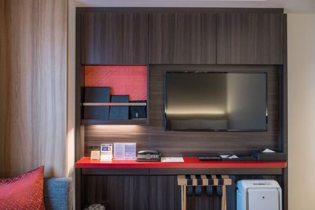 客室の備品はコンパクトに収納され、デスクワークでも使いやすいテーブルを備えます。