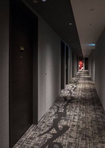 ▲客室階の廊下はカーペットに筆払いの模様が描かれます