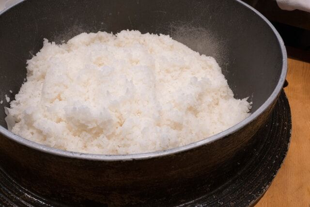 ご飯はお店で毎日精米し、大釜で炊き上げます。魚沼産コシヒカリは、もちっとしていてとても美味しかったです。
