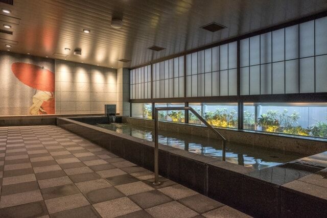 館内には雰囲気のある大浴場を備えます。男湯は松、女湯は赤い和傘をさした和装の女性のタイル画が飾られます。湯船の底には薄い緑色の十和田石を敷き詰め上質感をプラス。BGMはピアノやギターに加え電子音が織り重なり、水音と交わって心地よく、旅の疲れを癒せます。