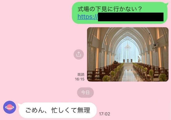 当時の私は、“彼はマリッジブルーなのかな?”と無理やり自分で納得してたんですけど、どうやら違ったみたいです。別れる直前に、私が思い切って『式場の下見に行かない?』とLINEをしたら、しばらく返信がなくて…。数日経ってから『ごめん、忙しくて無理』という返事がきました。