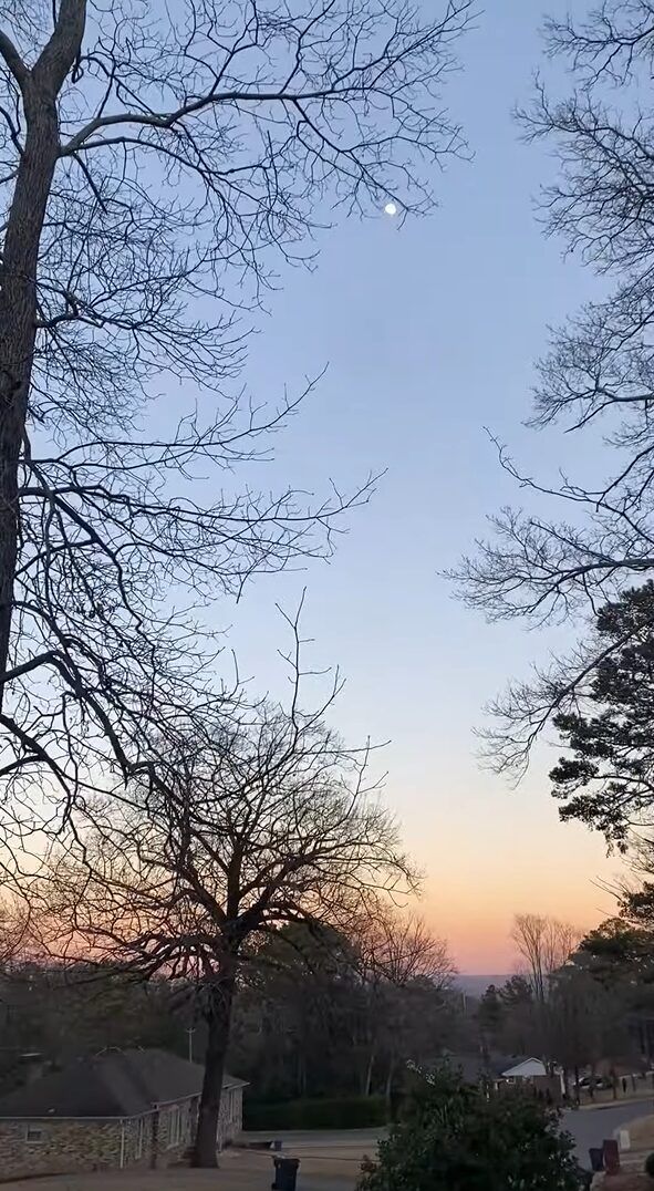 木々の間から見えるまん丸のお月さまです! 女の子は、昼間なのに空に月が昇っていることにビックリしたようです。