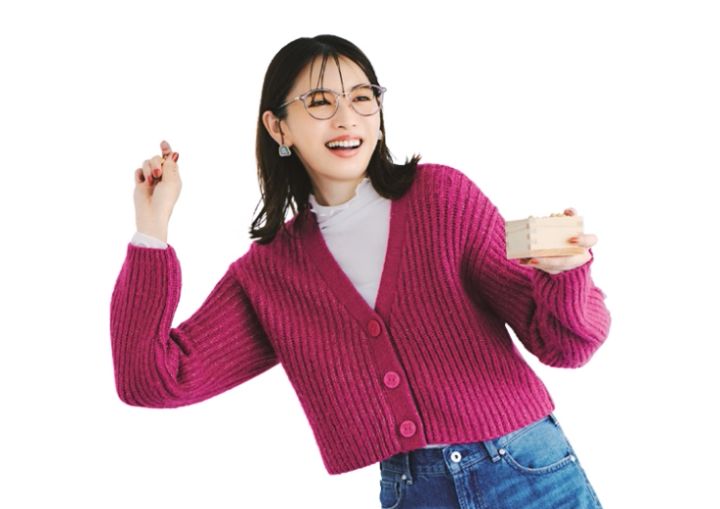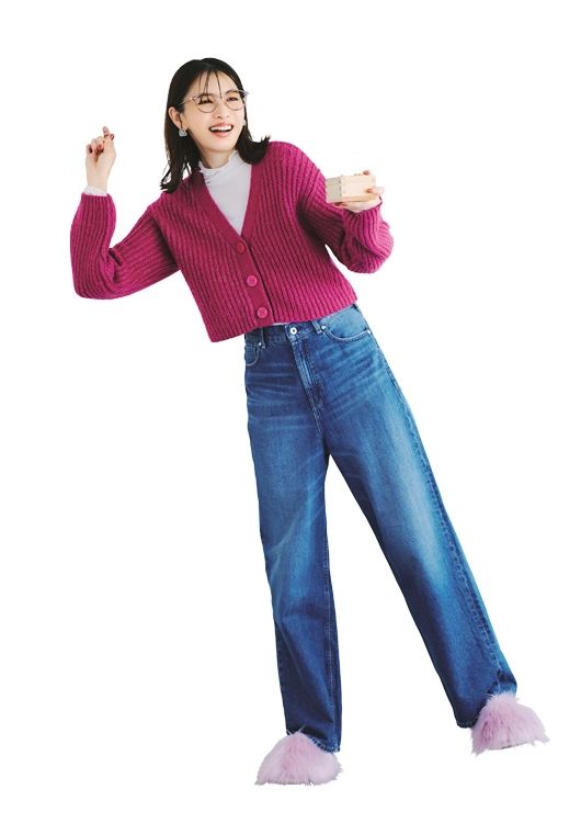 シアーニットに短丈ニットのバランスがいい塩梅。節分の豆をぶつけ合っても、今っぽいシルエットをキープできるデニムもさすが。