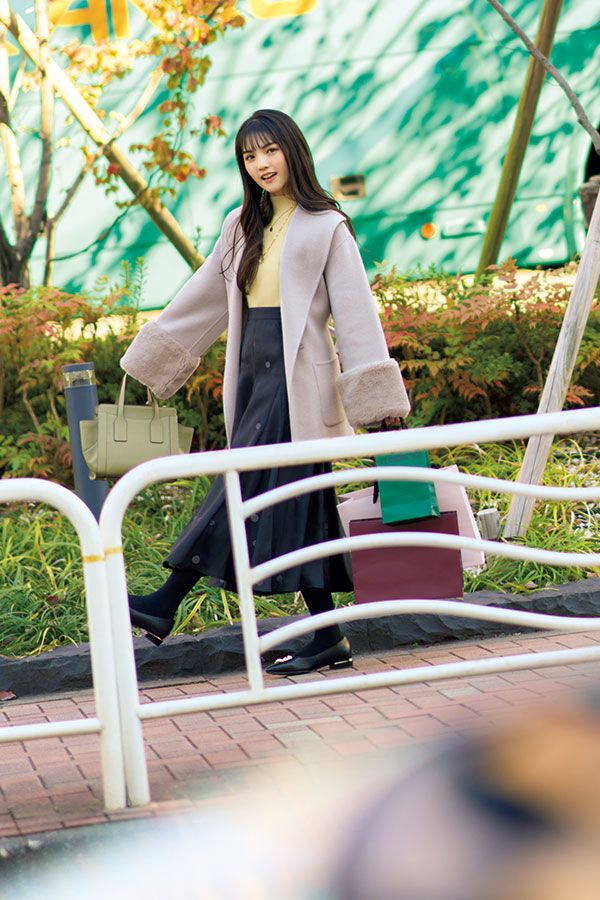 コート¥53,900/アプワイザー・リッシェ リブニット¥7,480/NATURAL BEAUTY BASIC スカート¥23,100/アルページュ ストーリー バッグ¥22,000/Jewelna Rose(Jewelna Rose 新宿ミロード店) フラットシューズ¥24,200/卑弥呼 2連ネックレス¥8,250/アビステ タイツ¥1,100/満足(福助)