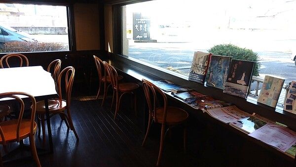 大黒屋さんには喫茶スペースがあり、テーブルと椅子、書籍や地元のフリーペーパーなども置いてありました。