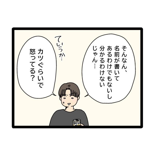 「そんなん、名前が書いてあるわけでもないし、わかるわけないじゃん・・。っていうか・・カツぐらいで怒ってる?」