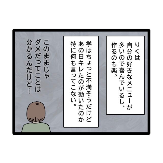 陸くんは、自分の好きなメニューが多いこともあって喜んでいるし、実際作るのも楽、学さんはちょっと不満そうに見えるけれど、あの日キレたのが効いたのか、特に何も言ってこない。