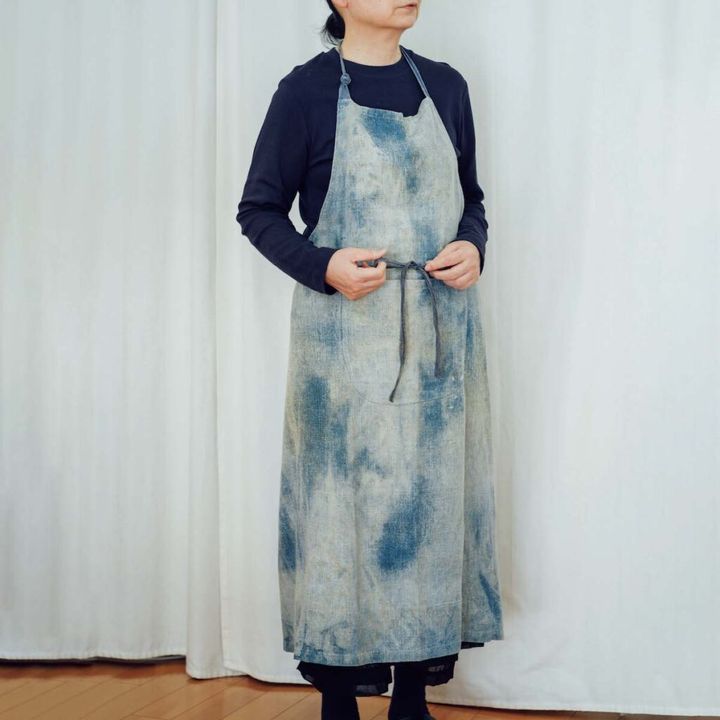 〈フードフォーソート〉のオリジナルアイテム。たっぷりとした布幅で、後ろで交差することでヒップが隠れ、スマートな立ち姿に。首紐と腰紐はヨレにくい太めのコットンテープを使用。