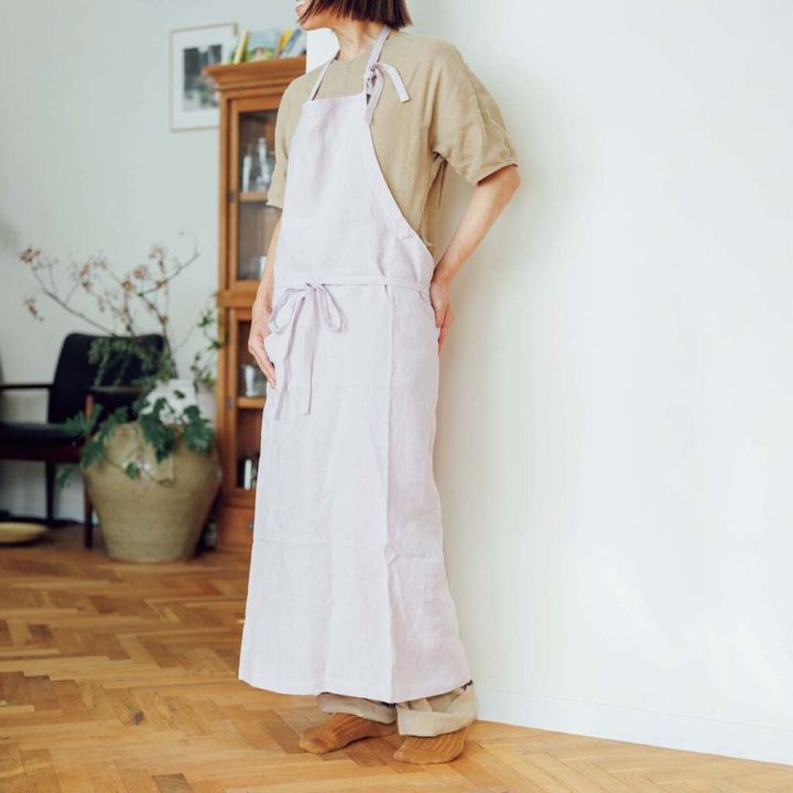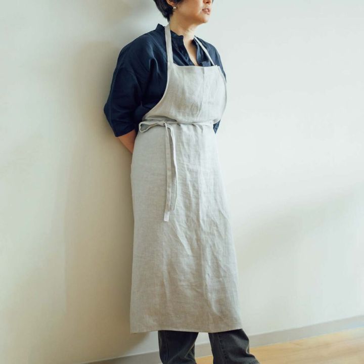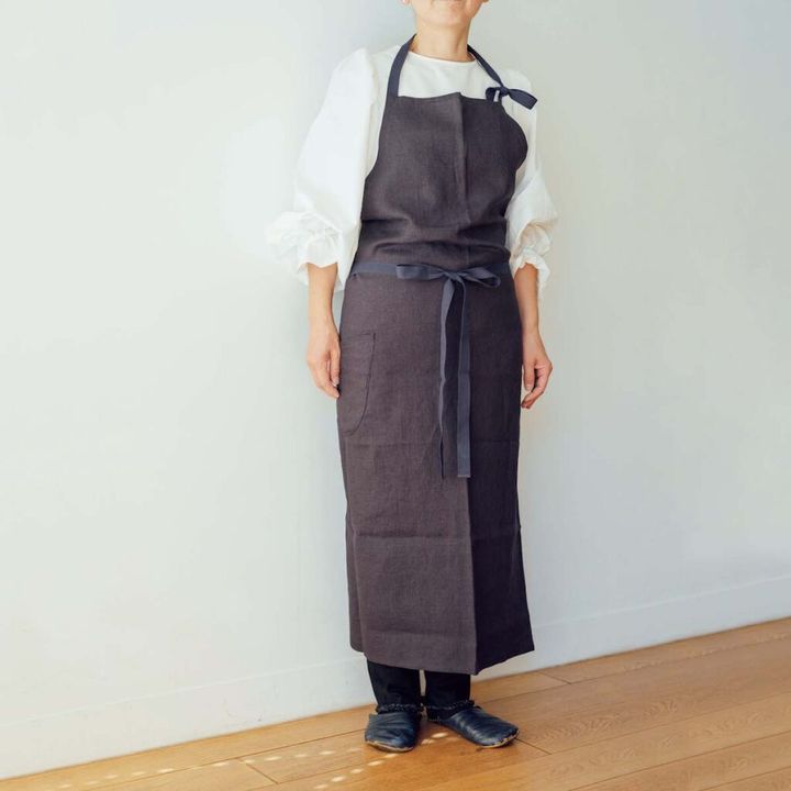 ワタナベさんが〈ルールマラン〉と作ったエプロンは前と後ろ、2か所にさっと手を入れやすいよう斜めにポケットが。グレーやホワイトなど色展開も豊富。