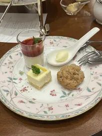 クロテッドクリーム、スコーン、柚子のレアチーズ、苺のパンナコッタ