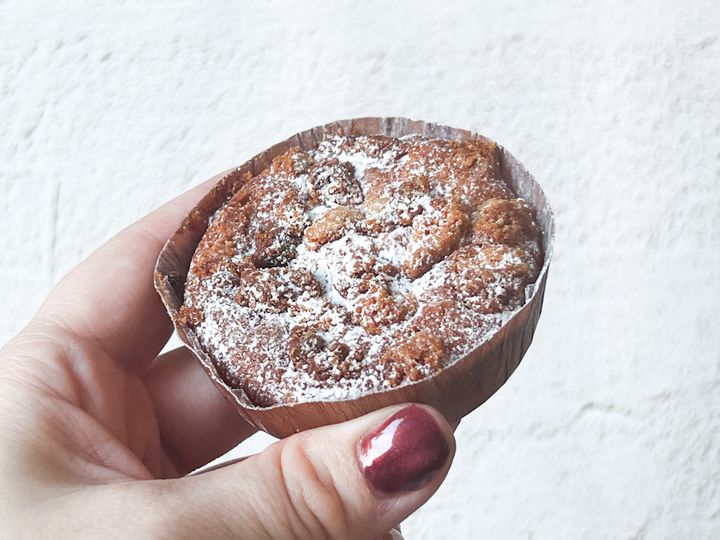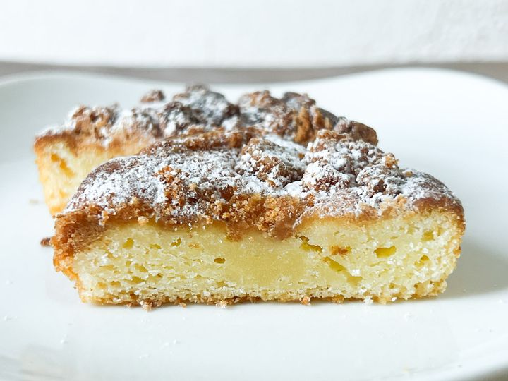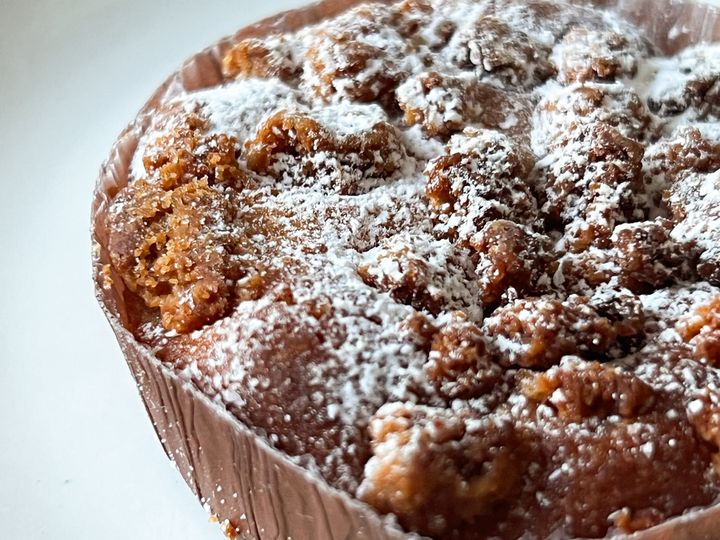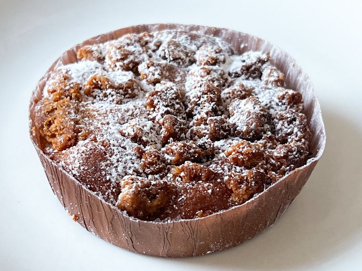 半分に切ってみると、中はしっとりとした感触。外側のクランブルがほろほろと崩れるので、食べる時には気をつけて。