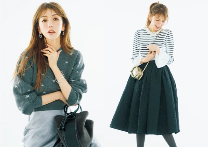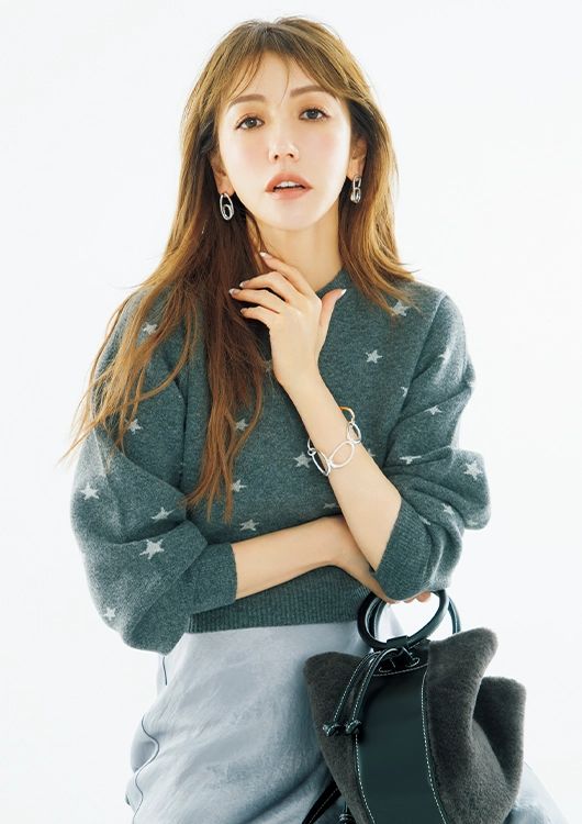 ニット¥8,690/31Sons de mode(ヒロタ) スカート¥19,800、バッグ¥16,500/ともにStola. ピアス¥7,150/インムード(フォーティーン ショールーム) ブレスレット¥2,530/アネモネ(サンポークリエイト)