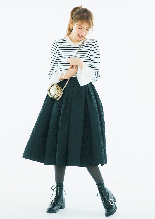 ボーダーニット¥15,400/マイストラーダ スカート¥36,300/シーニュ バッグ¥5,390/カシュカシュ(アンビリオン) ショートブーツ¥14,960/RANDA ピアス¥2,400/ヘンカ(ロードス) ネックレス¥18,700/インムード(フォーティーンショールーム) タイツ¥880/アツギザ・レッグバー(アツギ)