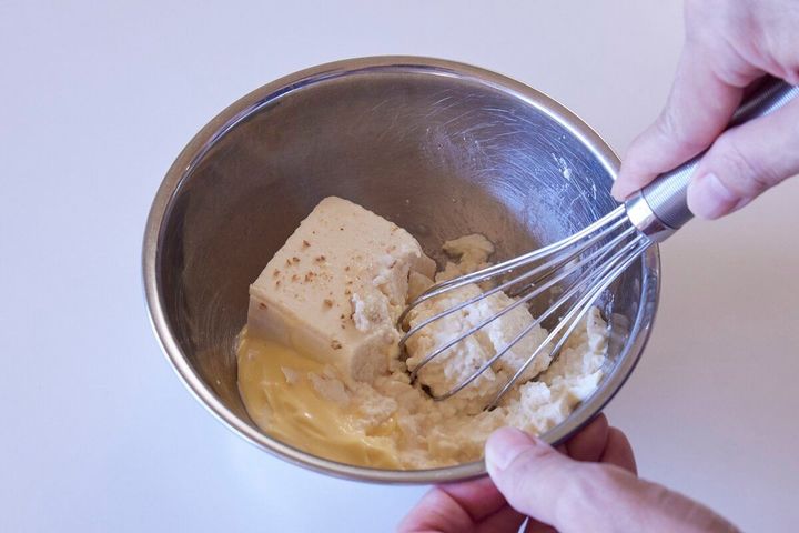 ボールに豆腐ソースの材料を入れ、泡立て器でなめらかになるまでよく混ぜる。