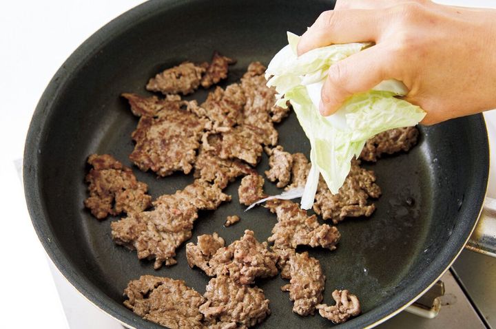 ひき肉はパックから直接フライパンに入れ、あえてほぐさずに、木べらを押しつけながら焼くことで、かたまりが残り、食べごたえが出ます!
