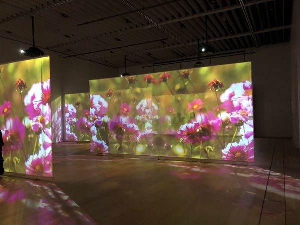 蝶に誘われながら、四季の花々をめぐる映像体験となっています。蝶のように浮遊する視点で、鑑賞者は時に花々が織りなす色彩に包まれながら鑑賞していきます。