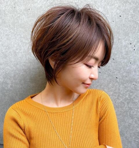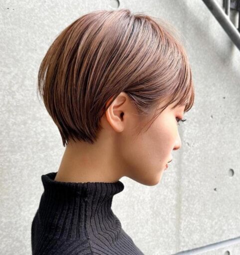 前髪長めの丸みシルエットのショートヘアは襟足をスッキリさせることでシャープさを演出。透明感の高いヘアカラーでさらなる軽さを出せば、全体の印象がコンパクトにまとまり、自然と小顔見せが叶います。また、耳出しと柔らかなスタイリングでオンナっぽさをさり気なくアピールするのもポイントです。