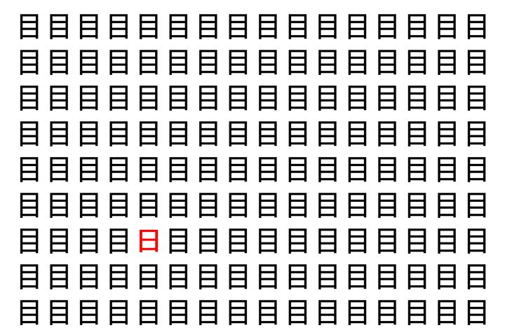 画像の中には、「目」という漢字が縦に9行、横に16個並んでいます。 全部で144個となりますが・・・、そのうち1つは「異なる漢字」となってますよ!!