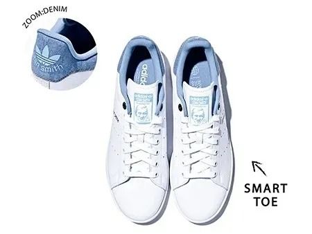 スリムなフォルムと履いていて飽きないシンプルなデザイン。王道の「スタンスミス」がデニム地をミックスして新登場。はき口のサイドから後ろにかけてデニムをドッキング。淡いブルーのトリミングが真っ白なボディのアクセント。
