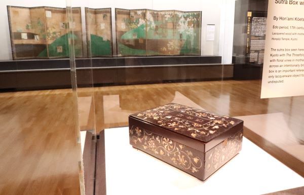 手前、重要文化財 花唐草文螺鈿経箱 本阿弥光悦作 江戸時代・17世紀 京都・本法寺蔵、奥、桜山吹図屛風 色紙:本阿弥光悦筆/屛風:俵屋宗達筆 江戸時代・17世紀 東京国立博物館蔵