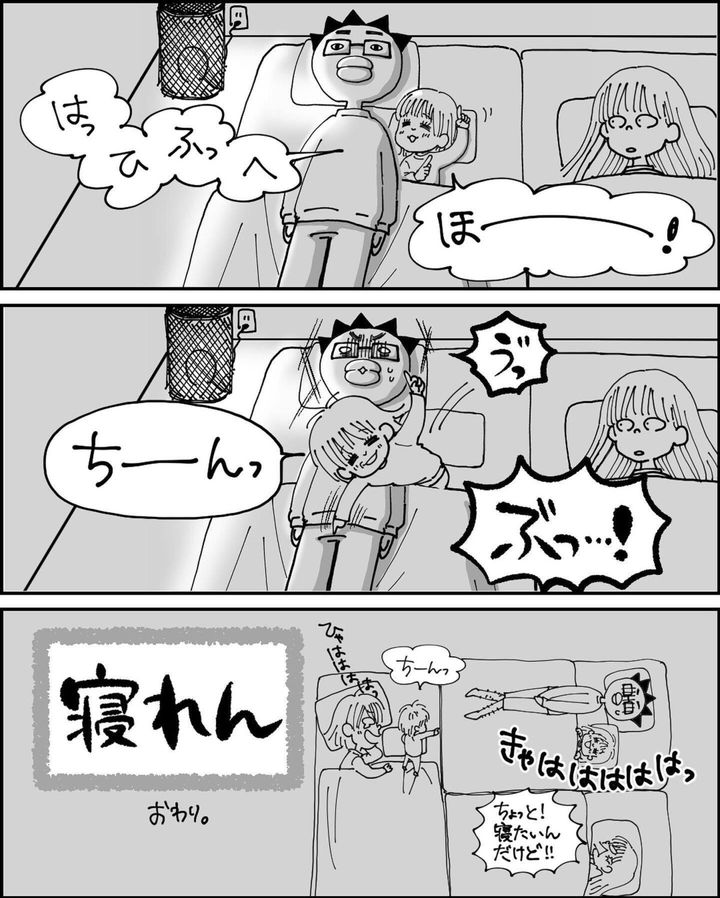子どもの寝かしつけは、手がかかることもあるけれど、優しくトントンされて寝入る姿は愛らしいですね。3姉妹ママの竹内文香(@ayyyyyaka.t)さんは、パパと一緒に寝かしつけをしていました。しかし、パパが居る方から「ドスッドスッ」という音が聞こえ始めます。おどろいて注意しようとすると、思わぬ展開が待ち受けていたのでした。