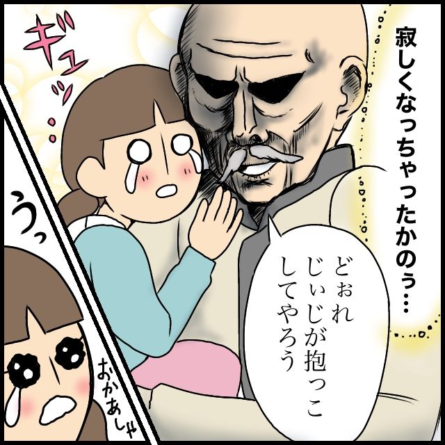 ママが恋しくなったかのぉ。どれ、寂しくないようにじぃじが抱っこでもしてやろうかの。