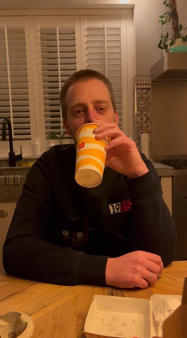 飲み物を飲みながら一息ついている男性。 実はこの映像の中には、猫がいるのです!