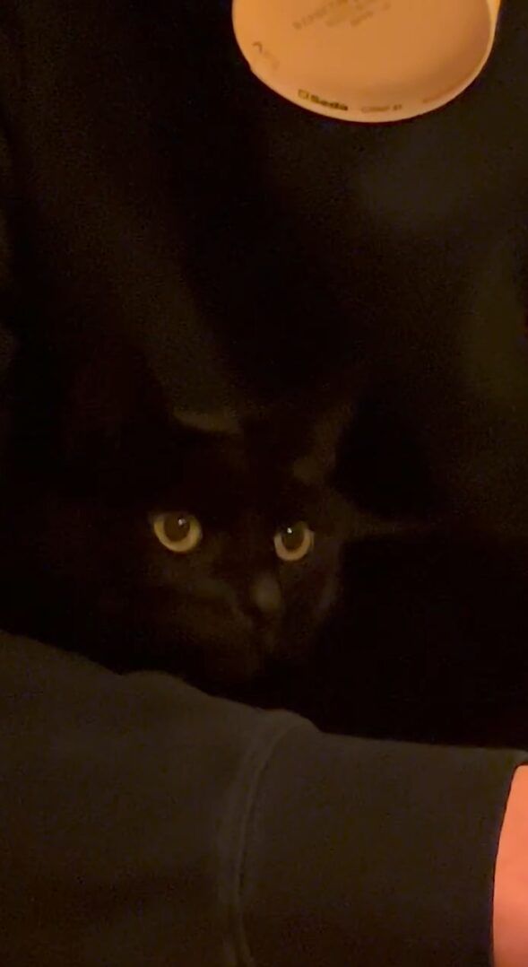 そう、猫は男性の腕の中にすっぽり収まっていたのです! 黒猫だったので、男性のスウェットとすっかり一体化していたみたいです。